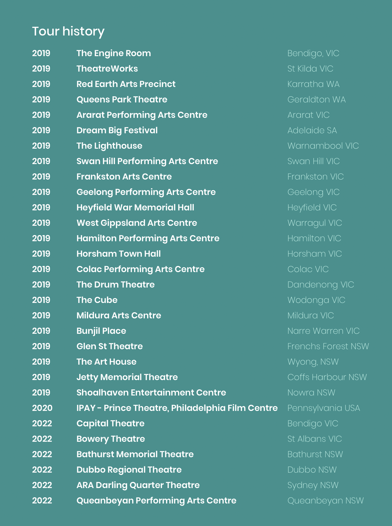 In 2026 Robot Song returns to Theatre Works St Kilda, The Round and Geelong Arts Centre [GAC] before Taking off for another Canadian and US tour culminating at the Prestigious Brooklyn Academy of Music [BAM]